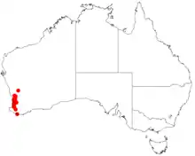 It is native to Swan Coastal Plain and South West regions of Western Australia where it is commonly situated on hills andslopes growing in granitic or lateritic soils.[2] It is found from around Mogumber in the north and follow down the Darling Range to around Wagerup in the south often as a part of jarrah woodland communities.[1]