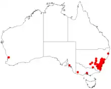 Acacia parramattensis is found in the Sydney Basin and Blue Mountains in central New South Wales, north to Yengo National Park,[1] west to Grenfell and south to Tumut,[2] from sea level to elevations of 900 metres (3,000 ft).[3] A component of dry sclerophyll forest or woodland, it is found in association with such trees as forest red gum (Eucalyptus tereticornis), Sydney blue gum (E. saligna), mountain white gum (E. dalrympleana), rough-barked apple (Angophora floribunda), turpentine (Syncarpia glomulifera), or in drier locations with gossamer wattle (Acacia floribunda), coast myall (A. binervia), or early green wattle (A. decurrens).[3] A. parramattensis is also a component of the rare and fragmented Southern Highlands Shale Woodlands community.[9]