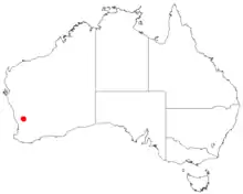 It is native to a small area in the Wheatbelt region of Western Australia where it is commonly situated in gullies growing in clay soils over and around areas of greenstone.[3] It has a limited distribution in the Wongan Hills where it is usually a part of mixed scrubland communities.[4] It is known from only two populations consisting of 49 mature plants in total found in the Shire of Wongan-Ballidu in an area of remnant natural vegetation where an estimated ninety five percent of native vegetation has been cleared for agricultural purposes within the Shire as a whole. One population is located on private property and holds forty seven percent of mature plants the other population is found in a nature reserve and contains the remainder of the mature plants.[2]