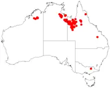 an area in the Kimberley region of Western Australia,[1][3] and north western Queensland and the Northern Territory.[3] It grows on stony and lateritic soils and on sandstone on plains and rocky ridges.[1] The soils are often shallow and are stony and sandy and are found in open woodland communities or with species of Triodia.[3]