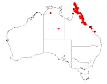 It is endemic to the parts of far north and northern Queensland in areas along the east coast. The northern range of the tree extends as far north as Banks Island in the Torres Strait down to along the eastern side of Cape York Peninsula to around Cairns in the south and has also been found on Palm Island. It is found along beaches and creeks and rivers where it grows in alluvial soils often as a part of vine thicket communities.[1]
