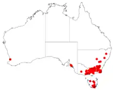 In is endemic to south-eastern Australia in the more elevated areas of the Great Dividing Range from around Tumut in New South Wales in the north through the Cotter Range and Australian Capital Territory down to around the Strathbogie Range and Macalister River in Victoria. It is often situated damp sheltered sites and along creeks and streams usually as a part of Eucalyptus forest and woodland communities.[2]