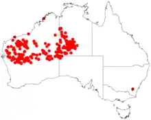 It is native throughout the arid centre of Australia, from Carnarvon, Western Australia, east to the Tanami Desert, Northern Territory and Mann Range, South Australia.[4] It is especially common along watercourses and in low-lying areas that receive drainage. The tree is found in many types of habitat usually in stony sand or loamy soils[1] and is associated with Acacia aneura and spinifex communities.[4]