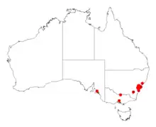 Endemic to New South Wales, Acacia pubescens is restricted to the Sydney Basin, where it is found in scattered populations from Bardwell Valley to Oakdale and Mountain Lagoon. Most plants are located around Bankstown, Fairfield and Rookwood in southwestern Sydney, and Pitt Town in the city's northwest.[10] Most of its habitat has vanished with the spread of housing in Sydney's suburbs,[5] and it is classified as "Vulnerable".[1] It is found on clay soils and associated plant communities—alluvial- and shale-based soils. It grows in open sclerophyll forest, associated with such species as grey box (Eucalyptus moluccana), broad-leaved ironbark (E. fibrosa), white feather honeymyrtle (Melaleuca decora), and blackthorn (Bursaria spinosa).[3]