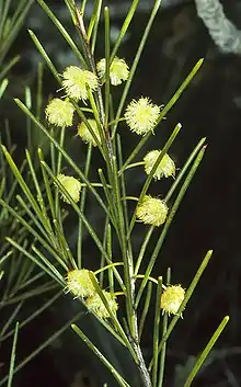 The shrub can grow to a height of up to 3 metres (9.8 ft) and has a spindly habit with slender lenticellular branchlets.[2] Like most species of Acacia it has phyllodes rather than true leaves. They are found on short stem-projections usually in groups of two or three in the nodes of mature branchlets with a rather crowded appearance. The slender, rigid, evergreen phyllodes are erect to inclined and more or less quadrangular in section. They are pungent and usually have a length of 2 to 6 cm (0.79 to 2.36 in) and a width of 0.5 to 1 mm (0.020 to 0.039 in) with four main nerves. The shrub bloom between July and September and[3] produces simple inflorescences that occur singly in the axils that have spherical flower-heads containing 12 to 30 cream to pale yellow coloured flowers. After flowering firmly chartaceous, dark brown seed pods that resemble a string of beads appear. The pods are up to 9 cm (3.5 in) in length and have a width of 3 to 4 mm (0.12 to 0.16 in) containing longitudinally arranged seeds. The dull black to dark mottled brown to yellow seeds have an oblong shape and a length of 4 to 6 mm (0.16 to 0.24 in).[4]