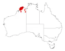 It is native to a large area in the Kimberley region of Western Australia where it grows among sandstone or laterite.[2] It is situated on the mainland extending from the coast south to the Mitchell Plateau and the catchment area of the Prince Regent River where it is usually found among outcrops of sandstone rock.[1]