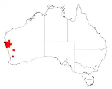 It is native to an area in the Mid West, Gascoyne and Wheatbelt regions of Western Australia where it is commonly situated on sandplains growing in sandy or sandy-loam soils.[1] The range of the plant extends from Ajana in the south to around Towrana Station in the north to the south of Gascoyne Junction where it is commonly a part of closed Acacia scrubland communities.[2]