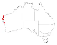 It is native to an area in the Mid West and Gascoyne regions of Western Australia from around Northampton in the south through to Exmouth in the north where it is found on coastal sand dunes growing in sandy[1] or clay soils often over limestone as a part of scrubland or heathland communities, often associated with species of spinifex.[2]