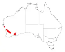 It is native to an area in the Wheatbelt and Mid West regions of Western Australia. where is found growing in clay, loam, sandy loam, and gravelly sandy clay soils.[1] It has a scattered distribution from around Kalbarri in the north west down to around Coorow in the south and Bruce Rock in the south east where it is usually a part of open Eucalyptus woodland communities.[2]