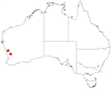 It is native to a small area in the Wheatbelt region of Western Australia where it is commonly situated on hillslopes growing in gravelly lateritic soils.[2] It has a very limited range in the Wongan Hills area where it is thought to be an opportunist in disturbed areas that is long living. It is usually found as a part of Mallee and Acacia shrubland communities that is often found with Allocasuarina campestris, Petrophile shuttleworthiana, Eucalyptus longicornis, Acacia acanthoclada, Acacia lasiocarpa and Acacia pulchella.[1] In 2006 there was an estimated 10,400 mature individual plants situated within fifteen separate populations found over an area of approximately 60 km2 (23 sq mi).[4]