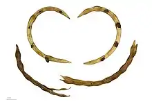 An astringent medicine high in tannins, called catechu or cutch, is procured from several species, but more especially from Senegalia catechu (syn. Acacia catechu), by boiling down the wood and evaporating the solution so as to get an extract.[26][27] The catechu extract from A. catechu figures in the history of chemistry in giving its name to the catechin, catechol, and catecholamine chemical families ultimately derived from it.