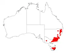 It is endemic to a large area with the bulk of the population found from around Nowra in New South Wales south through the Australian Capital Territory to around Mount Buller. Scattered populations are found further north in New South Wales and also in Tasmania. It is often situated near and around creeks and streams growing in rocky or sandy soils as a part of open Eucalyptus forest communities.[1]