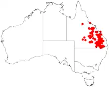 It is endemic to parts of Queensland and New South Wales and is fairly widespread throughout the Darling Downs region. The northern end of its range is to about 120 km (75 mi) to the south of Charters Towers it is found as far as Adavale to the west and down to around Yetman in the south.[1] The tree will often forms dense stands and is sometimes associated with Acacia shirleyi and also as a part of open forests and Eucalyptus woodlands growing in shallow stony soils usually over a bed of weathered sandstone.[1]