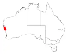 It is native to an area in the Mid West region of Western Australia where it is often situated on low rises and sandplains growing in sandy or sandy-loam soils.[1] The range of the plant extends from around Geraldton in the south to about 50 km (31 mi) north of the Murchison River where it is usually a part of mixed open scrub, tall shrubland or open heathland communities.[2]