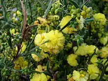 It is a rigid and prickly shrub that typically grows to a height of 0.2 to 0.7 metres (0.7 to 2.3 ft)[2] but can reach as high as 2 m (7 ft). It can have a scrambling, sprawling or tangled erect habit.[2] The shrub has ridged stems and curving spine-tipped phyllodes that form continuous wings along the stem.[3] It produces globular, cream or yellow flowerheads between March and December in the species' native range.[1][2] After flowering it will produce quadrangular seed pods that are 3 to 7 centimetres (1.2 to 2.8 in) long with prominent ridges.[3]