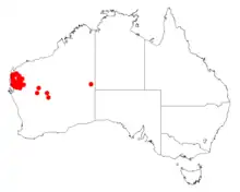 Endemic to Western Australia, it occurs only in a small area of the Gascoyne River catchment near Carnarvon with outlying population near Wiluna.[2] It is often found situated in low-lying area, along creeklines[1] or on rocky ground growing in red loamy soils and is commonly associated with Acacia sclerosperma and Acacia tetragonophylla and sometimes with Acacia ancistrocarpa.[2]