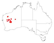 It is native to an area in the Mid West, Goldfields and Pilbara regions of Western Australia where it has a[2] scattered distribution from the Pilbara region in the from the east of Paraburdoo north down to around Meekatharra in the south west and Leinster in the south extending out to around Mount Nossiter in the Little Sandy Desert in the eastern edge of its range. It is often situated on ridges and rocky slopes near the base of ranges composed of banded ironstone growing in skeletal soils as a part of open shrubland communities where it is usually associated with Acacia aneura, Acacia sibirica and Eremophila jucunda.[1]