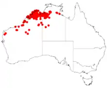 It is native to arid areas of spinifex plains in northern Australia. It is distributed throughout the inland Pilbara and Kimberley regions of Western Australia,[1] and east into the Victoria River region of the Northern Territory usually growing in shallow sandy soils of sandstone.[1] It is often situated in gully floors and on hillsides as a part of open Eucalyptus woodland communities.[2]