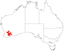 It is native to an area in the Wheatbelt region of Western Australia where it is commonly situated in low-lying areas or on undulating plains growing in sandy clay or sandy-loamy soils.[1] The range of the plant extends from around Bruce Rock and Tammin in the north down to near Lake Grace in the south west and Lake King in the south east where it is often a part of open shrub mallee communities.[2]