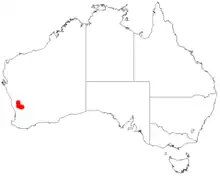 It is native to an area in the Wheatbelt region of Western Australia where it is found growing to sandy or loamy soils.[3] It has a limited range with the bulk of the population found from near Wongan Hills in the south east to around Watheroo further to the north west and is usually a part of low scrub communities.[4] These is a total of 17 known populations composed of a total of around 2033 mature plants with most populations having less than 40 plants.[2]