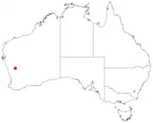 The species is found in a small area near Perenjori in the Mid West region of Western Australia. It grows red silt and thin sands over red ironstone and laterite on crests and ridges of ranges.[2] Only three populations in the Blue Hill Range are known. Each population is within 1 to 5 kilometres (0.6 to 3.1 mi) of the next and covers an area of around 40 square kilometres (15 sq mi) in total. The species is mostly found in tall shrubland communities or thickets dominated by other Acacia species, Allocasuarina acutivalvis or Eucalyptus petraea[1]