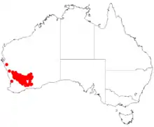 It is endemic to an area in the Whearbelt and Goldfields regions of Western Australia where it is found on sandplains, rocky rises and flats growing in sandy, loamy, clay or gravelly soils.[1] The species is found between Wubin in the north and extends in a south easterly direction down to around Peak Charles National Park where it is a part of mallee heath and open shrubland communities.[2]