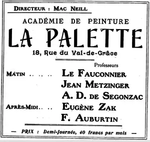 Académie de La Palette, also called Académie La Palette and La Palette, (English: Palette Academy), was a private art school in Paris, France, active between 1888 and 1925, aimed at promoting 'conciliation entre la liberté et le respect de la tradition'.[1][2]