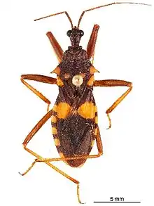 The adult Acanthaspis quinquespinosa is a warningly-coloured, winged assassin bug that varies in appearance depending on the habitat in which it occurs. The overall colour is dark brown to black, with a reddish-brown abdomen and legs, and yellowish spots on the pronotum and fore-wings. There are two spines or prominent tubercles near the centre of the posterior lobe of the pronotum, and two long spines at the posterior margin; the scutellum bears a single spine at its apex. The insects are about 2 cm (0.8 in) long, with males being somewhat smaller than females.[2][3] It is a common species; the colouring is similar to that of Acanthaspis angularis and Acanthaspis flavipes, but they can be distinguished by differences in the male genitalia.[3]