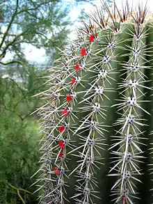 For example, columnar cactus spines grow from the apex of the plant. After several weeks the spines stop growing and have been moved to the side of the stem. The old spines remain in place for decades as new spines are created at the continually growing apex.[1] The result is that along each external "rib" of the cactus is a series of spines arranged in the order they grew in – the oldest spines are at the bottom and the youngest spines are at the top. These spines can be dated using bomb-spike[2] Carbon-14 and isotopes of carbon (Carbon-13) and oxygen (Oxygen-18) may be used to infer past climate[3] (e.g. precipitation or temperature), plant stem growth[4] or plant physiology (e.g. photosynthetic processes).[5] Alternatively, the width of small transverse bands[6] in the spine may be used to infer daily information about cloud cover or plant productivity, although this remains to be tested. It has also been shown that regular waxy banding on the sides of a Costa Rican cactus (Lemaireocereus aragonii) indicate annual growth and can be used as temporal chronometers.[7]
