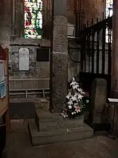 Acca was buried at Hexham near the east wall of the abbey.[1] Two finely carved crosses, fragments of one of which still remain, were erected at the head and foot of his grave.[5] He was revered as a saint immediately after his death. His body was translated at least three times: in the early 11th century, by Alfred of Westow, sacrist of Durham;[5] in 1154, at the restoration of the church, when the relics of all the Hexham saints were put together in a single shrine; and again in 1240. His feast day is 20 October. The translation of his relics is commemorated on 19 February.