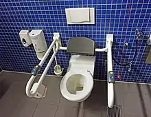 - a wheelchair-height toilet, to help the user on and off the toilet, with handles (grab bars);