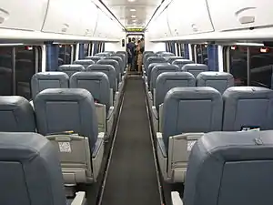 The First Class car has 44 seats, being three seats across (one on one side, two on the other side), four seat tables and assigned seating. There are 260 Business Class seats on each set; these cars have four seats across (two on each side) and four-seat tables.[42] Baggage may be stowed in overhead compartments or underneath seats. Trains are wheelchair-accessible. Each car has or two toilets, with one being ADA compliant. Automatic sliding doors between cars reduce noise.