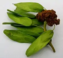 The mite usually attacks the flower clusters soon after they open. The individual gall is no more than 2 cm across but when grouped together can be impressive as they present a sizable irregular deformity formed from the fused and swollen flower stalks (pedicels).[5] The gall has also been found on buds, leaf stalks, twigs or trunks. It is brown when fully formed, finally black, but green at first. Once the leaves have fallen, the galls, filled with mites, are obvious and may remain for a year or more. Leaflets or entire leaves and petioles may also be involved, with additional distortions such as thickening and leaf lamina rolling, especially when the tree is heavily infested.[1][2][4] Almost every inflorescence may be involved, the reproductive capacity therefore being reduced, however some seeds may still develop normally amongst the galls.[2]