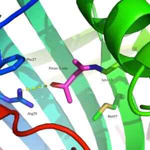 Acetoacetate decarboxylase from Clostridium acetobutylicum catalyzes the decarboxylation of acetoacetate to yield acetone and carbon dioxide (Figure 1). The reaction mechanism proceeds via the formation of a Schiff base intermediate, which is covalently attached to lysine 115 in the active site. The first line of support for this mechanism came from a radiolabeling experiment in which researchers labeled the carbonyl group of acetoacetate with 18O and observed that oxygen exchange to water, used as the solvent, is a necessary part of decarboxylation step.[9] These results provided support that the mechanism proceeds through a Schiff base intermediate between the ketoacid and an amino acid residue on the enzyme.