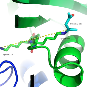 This enzyme has been of particular interest because it is a classic example of how pKa values of ionizable groups in the enzyme active site can be significantly perturbed. Specifically, the pKa value of lysine 115 in the active site is unusually low, allowing for the formation of a Schiff base intermediate and catalysis.[2]