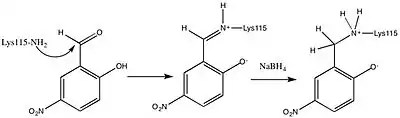 Building upon this finding, Westheimer et al. directly measured the pKa of Lys115 in the active site using 5-nitrosalicylaldehyde (5-NSA) . Reaction of 5-NSA with acetoacetate decarboxylase and subsequent reduction of the resulting Schiff base with sodium borohydride led to the incorporation of a 2-hydroxy-5-nitrobenzylamino reporter molecule in the active site (Figure 2). Titration of the enzyme with this attached reporter group revealed that the pKa of Lys115 is decreased to 5.9 in the active site.[12] These results were the basis for the proposal that the perturbation in the pKa of Lys115 was due to its proximity to the positively charged ε-ammonium group of Lys116 in the active site.[2] A nearby positive charge could cause unfavorable electrostatic repulsions that weaken the N-H bond of Lys115. Westheimer et al.'s proposal was further supported by site-directed mutagenesis studies. When Lys116 was mutated to cysteine or asparagine, the pKa of Lys115 was found to be significantly elevated to over 9.2, indicating that positively charged Lys116 plays a critical role in determining the pKa of Lys115.[2] Although a crystal structure was not yet solved to provide structural evidence, this proposal was widely accepted and cited as a textbook example of how the active site can be precisely organized to perturb a pKa and affect reactivity.[8]