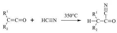 The photochemical and thermal reactions of acetyl cyanide have been extensively studied. For example, formyl cyanide does not undergo unimolecular decomposition to HCN and CO spontaneously. However, acetyl cyanide, also a member of this family, breaks down through this unimolecular decomposition at 470 °C. This reaction occurs through decarbonylation. This division of the molecule to a ketone and hydrogen cyanide were noted to be under competitive circumstances. This caused a study of the thermal unimolecular reactions that acetyl cyanide undergoes.