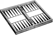 The initial rolling of one die is called the peewee or piddle. The bar is the fence, and a single man is kicked rather than hit. The opponent's inner table is called the entering table or starting quarter, and one's own inner table is the finishing quarter.[5]