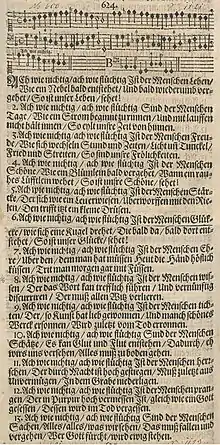 The hymn originally consisted of 13 stanzas of five lines each. All odd stanzas begin with "Ach wie flüchtig, ach wie nichtig" ("Oh how fleeting, oh how vain"), and all even stanzas begin "Ach wie nichtig, ach wie flüchtig" ("Oh how vain, oh how fleeting"). The second line specifies what is fleeting, which is expanded by lines three to five, all of which rhyme. Eight of the stanzas are included in the current Protestant hymnal Evangelisches Gesangbuch as EG 528.[3]