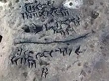 The Achaemenid inscription in the Kharg Island is an important inscription from the Achaemenid Empire that was discovered in 2007 while constructing a road. It is located on Kharg Island, Iran. This inscription is written in Old Persian language with Old Persian cuneiform alphabet. The height and the width of this inscription is around one meter. The inscription was etched around 400 BC.[1][2] The inscription contains five lines and six Old Persian words, five of which were unknown at the time it was discovered. The inscription reads as “The not irrigated land was happy [with] my bringing out [of water]”.[3] The linguist Habib Borjian explains that if the inscription is authentic, combined with the island's known history of kariz usage, "which came about under the Achaemenid rule in the Near East (550–330 BCE)", it can be suggested that there was a Persian colonisation of Kharg under the Achaemenids.[3] The Iranian dialect of the Persian settlers of the Achaemenid period may have in turn been the ancestor of the Khargi language, with Borjian adding that "there is no contradicting evidence to make this hypothesis implausible".[3] Some Arab states of the Persian Gulf have unsuccessfully tried to show that the inscription is forged.[2] In 2008, the inscription was severely vandalized and now 70 percent of the text is destroyed and only one line of inscription survived. Kharg island is an important island belonging to Iran and a license is needed for travel to the island. The Cultural Heritage, Handcrafts and Tourism Organization of Iran said that "This inscription is an evidence to the name of Persian Gulf".[2]
