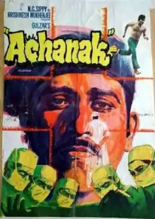 Achanak (translation: Suddenly) is a 1973 Indian Hindi film, directed by Gulzar, written by Khwaja Ahmad Abbas, and starring Vinod Khanna. Gulzar received a Filmfare nomination as Best Director for this film. Even though Gulzar is an accomplished lyricist, this film did not have any songs in it.[1] K.A. Abbas earned a Filmfare nomination for best story.[2] It is inspired by the real-life sensational 1958 murder case KM Nanavati v State of Maharashtra.[3]