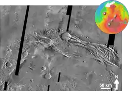 Acheron Fossae is a trough in the Diacria quadrangle of Mars. Its location is centered at 37.67° north latitude and 135.87° west longitude. It is 718 km long and is named after a classical albedo feature at 35°N, 140°W .[1] The trough has seen intensive tectonic activity in the past. Despite its crescent shape similar to the nearby aureole surrounding Olympus Mons, it is unrelated to them and predates the aureole which are Amazonian in age while Acheron is Hesperian in age.