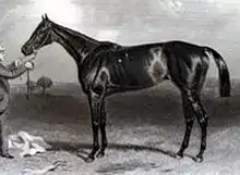 Achievement was a strikingly attractive dark brown filly standing 15.3 hands high.[2] She was foaled in 1864 at Oakley Hall, the stud farm of Colonel (later General) Mark Pearson which was located twenty miles outside of Oakham in Northamptonshire.[3] She was sired by Stockwell, winner of the 1852 St. Leger and 2,000 Guineas Stakes and a seven time leading sire. Achievement's dam, Paradigm, was not "fashionably bred" being sired by Paragone, a "3-guinea" sire noted more for producing hunt horses than racehorses.[4] Paradigm's dam, Ellen Horne, was purchased by Pearson for around 18 guineas for his wife to use as a hack horse.[5] Paradigm was an unsuccessful racehorse, running only twice and placing in the Lavender Stakes as a two-year-old before injury forced her retirement from racing.[6] Like her dam, Paradigm was also used as a hack before she entered the stud.[4] Paradigm was later heralded as a worthy broodmare. In 1863, she had produced Achievement's full brother, Lord Lyon, the winner of the 1866 English Triple Crown. Paradigm produced a total of 13 foals and also produced King at Arms, Man at Arms and Blue Mantle.[6]