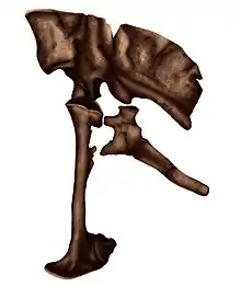 The scapulocoracoid was formed by the fusion of the scapula and coracoid. In the posterior area of the acromion process, the scapula had a small tubercle that attached the area for the muscle m. scapulohumeralis in life. The glenoid was located at the bottom area facing to the lateral side. The scapula was relatively elongated and flattened at the scapular blade. The blade is thickened and slightly curved to the inner side following the rounded shape of the rib cage. The coracoid is robust and broad, measuring 16.7 cm (167 mm) long and 14.8 cm (148 mm) in height. The anterior edge had a coarse texture, likely for the articulation with cartilaginous tissue. A large foramen was located from the front to the back, probably acting as a channel for blood vessels and nerves. The radius measured 26 cm (260 mm) long.[1]