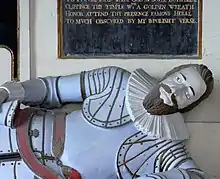 - Arthur Acland (died 1610) (eldest son and heir) whose impressive monument with effigy and inscription survives in the Acland Aisle in Landkey Church. Little is known about his life and career. Arthur Acland married his step-first cousin Eleanor Mallet (1573–1645),[28] a daughter and co-heiress of Robert Mallet of Wooleigh,[28] in the parish of Beaford,[31][32] near Great Torrington,[33] Devon. Wooleigh adjoins Potheridge, separated by the River Torridge. Eleanor's mother (or step-mother) was Elizabeth Rolle (a daughter of George Rolle (died 1552) of Stevenstone, the founder of a Devonshire land-owning dynasty even greater than the Aclands), who re-married to Sir John Acland (died 1620) of Columb John, Sir Arthur's uncle. Eleanor survived Sir Arthur and remarried to Sir Francis Vincent, 1st Baronet[28] (c. 1568 – 1640) of Stoke d'Abernon,[34] in Surrey.