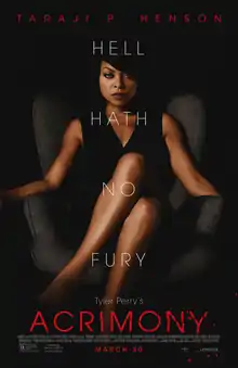 Acrimony is a 2018 American psychological thriller film written, produced and directed by Tyler Perry. The film stars Taraji P. Henson, Lyriq Bent and Crystle Stewart. It follows a loyal wife who decides to take revenge on her ex-husband who has wronged her in life. Principal photography began in October 2016 in Pittsburgh. Acrimony was released in the United States by Lionsgate on March 30, 2018.[5][6] It received generally negative reviews and grossed $46 million worldwide.