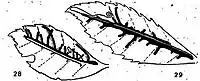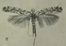 The host plant for the species is Pseudopanax arboreus.[2] They mine the leaves of their host plant. The larva, on hatching, at once mines into the leaf through the shell of the egg, and as a general rule takes several spiral turns before mining in any definite direction. The mine throughout is a very gradually widening gallery, never becoming blotched, and rarely do portions cross each other except in the smaller leaves. Its direction invariably takes it along both sides of the midrib, this obstacle being crossed in its upper and thinner part. From these long straight portions a varying number of blind arms or branches of varying lengths, mostly straight but sometimes slightly curved, sprout out into the leaf. As a rule the greater number will be confined to one half of the leaf. These blind branches sometimes follow the course of the veins of the leaf, but most often do not, generally treating these as no obstacle. They do not often reach as far as the outer margin of the leaf, but may do so, and may follow it a short distance. These branches are all more or less parallel to one another, and rarely cross. The mine is found only in the younger leaves, and is pale green in colour, the tips of the branches often being white, showing where the larva came close against the upper cuticle. Old mines become white, but otherwise do not discolour the leaf. The frass is very finely granular.