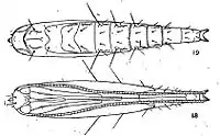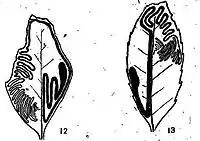 The mine made by the South Island form differs somewhat. In the earlier part the mine is a simple vermiform gallery. Later, however, instead of ending in a somewhat tortuous and widened gallery, it expands into a relatively large blotch, which may occupy the entire leaf, or all or the greater part of one half of the leaf in larger leaves. The entire mine is on the upper surface of the leaf, and is pale green in colour. The midrib forms a barrier in its basal two-thirds. The blotch is irregular in shape, but all irregularities are rounded. The frass is finely granular, black and scanty. Old mines soon become white and conspicuous.