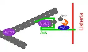 ActA is a protein which acts as a mimic of Wiskott-Aldrich syndrome protein (WASP), a nucleation promoting factor (NPF) present in host cells. NPFs in the mammalian cell recruit and bind to the already existing actin-related-protein 2 and 3 complex (Arp2/3 complex) and induce an activating conformational change of the Arp2/3 complex.[6] Due to this conformational change, NPFs initiate polymerization of a new actin filament at a 70° angle, which leads to the characteristic Y-branched actin structures in the leading edge of motile cells. ActA localizes to the old pole of the bacterium and spans both the bacterial cell membrane and the cell wall, lateral diffusion is inhibited; thus ActA localizes in a polarized and anchored manner on the bacterial surface. Consequently, actin polymerization only starts in this region on the surface of the bacterium.[7] Expression of ActA is induced only after entering a mammalian host cell.[8]