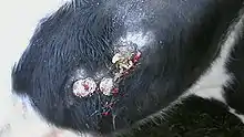 The affected areas can be treated with iodine solutions. A common method to achieve this is to give the cattle sodium iodide orally on a regular treatment schedule. Antibiotics such as tetracyclines are also used, alone or with iodine; simultaneous use is considered more aggressive. Killing the bacteria that cause the infection is the ultimate purpose of these treatment methods. However, treatment may not be effective unless it is started early.[3][4] Notably, surgery is not typically considered for treatment of production cattle.[5]